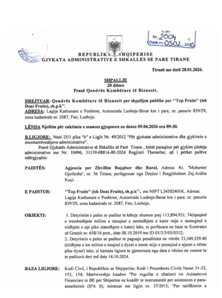 Kapitali publikon dokumentin e padisë, ku AZHBR i kërkon kompanisë më të mandhe të grumbullimit të fruta perimeve në vend të kthejë shumën e grantit të përfituar në vitin 2019, së bashku me penalitetet përkatëse.