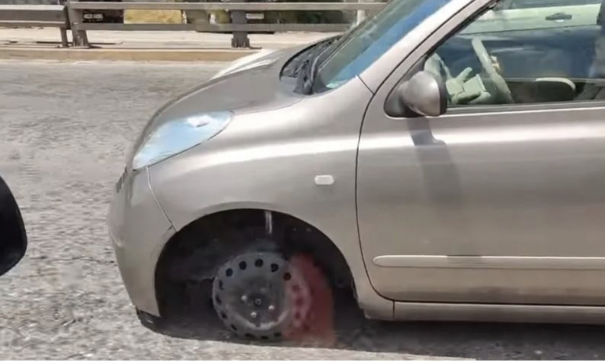 Nuk dihet se çfarë ka shkaktuar humbjen e gomës dhe një pjese të parakolpit nga Nissan Micra që është parë në Autostradën Kombëtare në drejtim të Pireut.