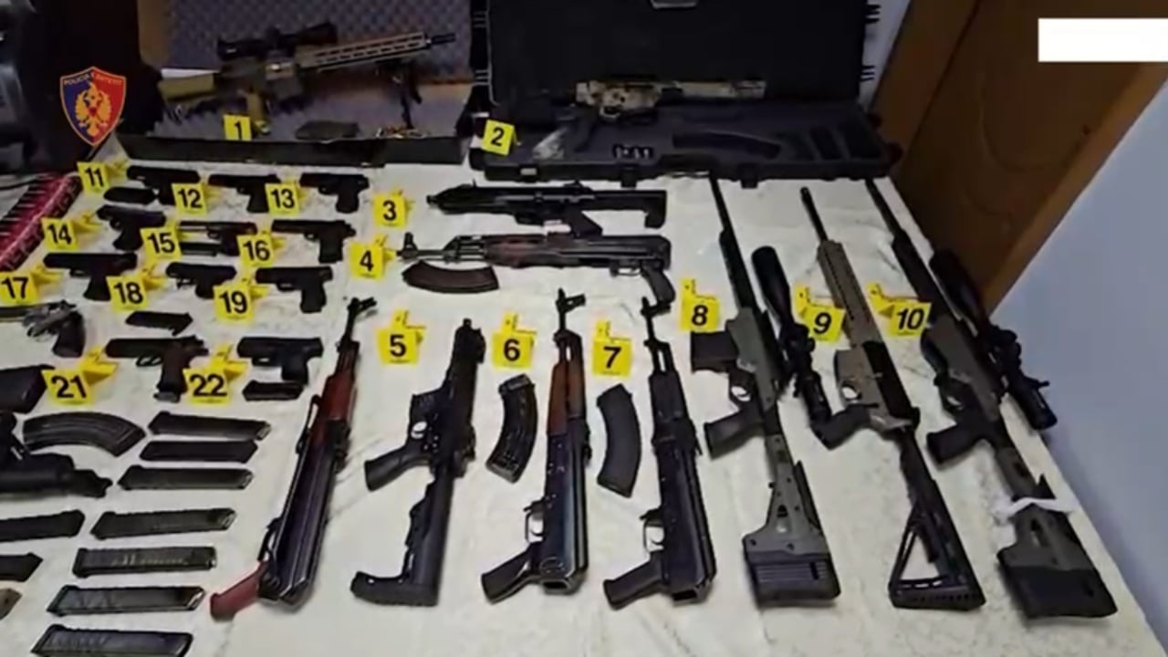 Në Tiranë është zbuluar një bazë e fshehtë me një arsenal të armëve të dyshuara të trafikuara, ku është arrestuar Eugert Sino, 34 vjeç, i cili dyshohet se i posedonte këto armë. Policia ka sekuestruar gjithsej 23 armë zjarri, përfshirë 5 armë me snajper, një silenciator, 17 krehra me municion luftarak, pajisje për shpërthime në distancë, celularë, uniforme si të Policisë dhe sende të tjera të paligjshme.