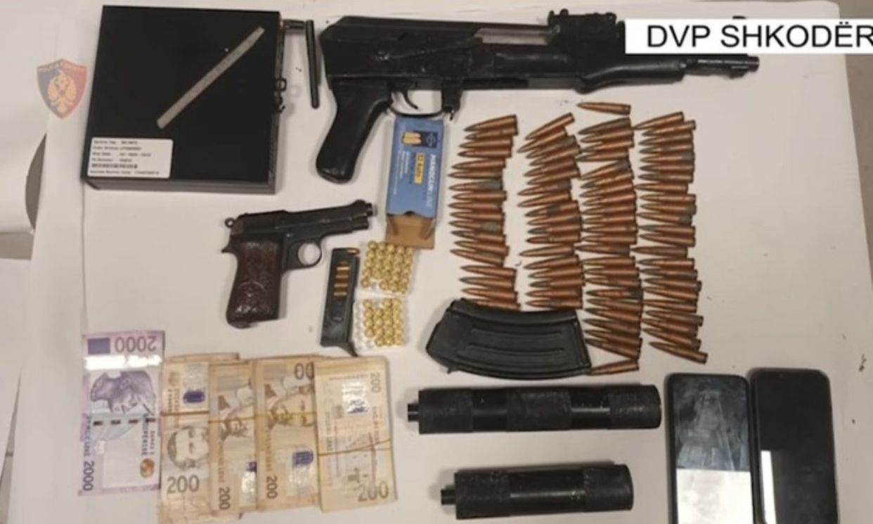Në pranga ka rënë 35-vjeçari Altin Palushi, ndërsa gjatë kontrollit në banesën e tij, policia ka sekuestruar edhe dy armë me silenciator, një pistoletë dhe një kallashnikov si dhe sasi municionesh.