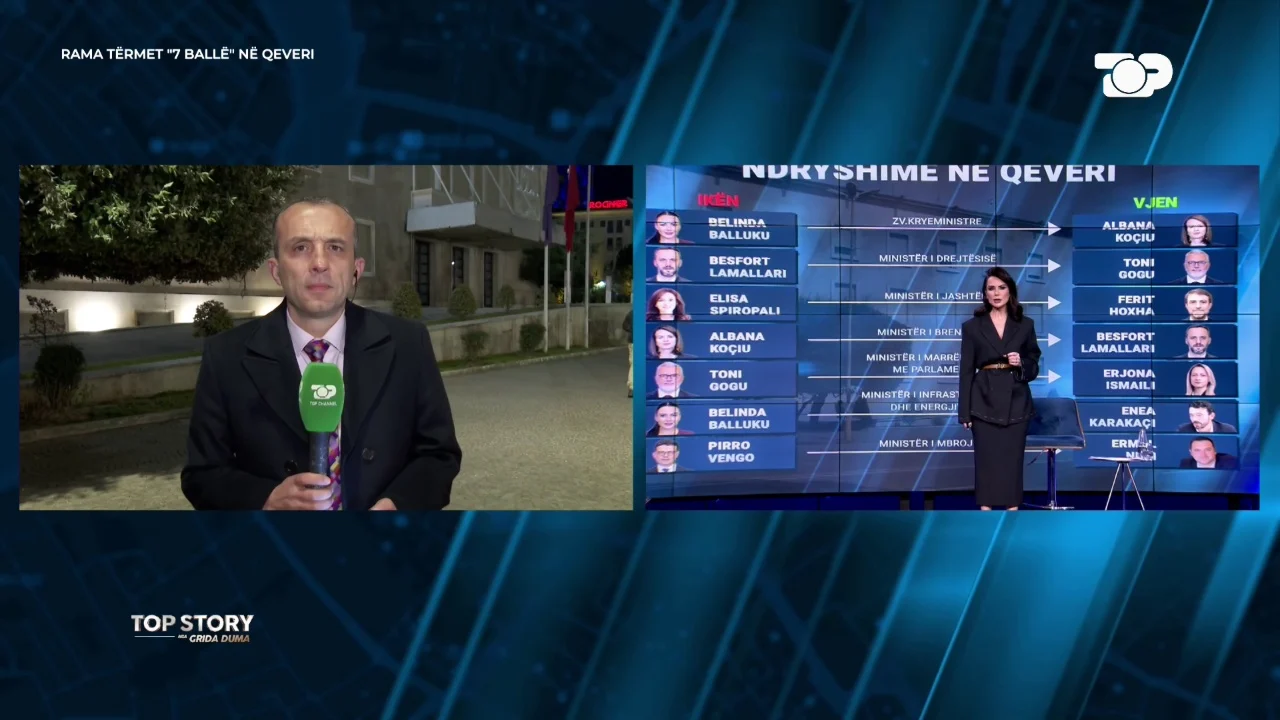 Gazetari i Top Channel, Muhamed Veliu, raportoi në “Top Story” për ndryshimet në qeveri që u njoftuan gjatë mbledhjes së grupit parlamentar të Partisë Socialiste (PS). Në një lidhje direkte, ai theksoi se para se Edi Rama të shpallte ndryshimet, ai kishte bërë një koment të veçantë për Belinda Ballukun, duke e cilësuar të vështirë zëvendësimin e saj për shkak të karakterit të saj të fortë dhe angazhimeve politike.