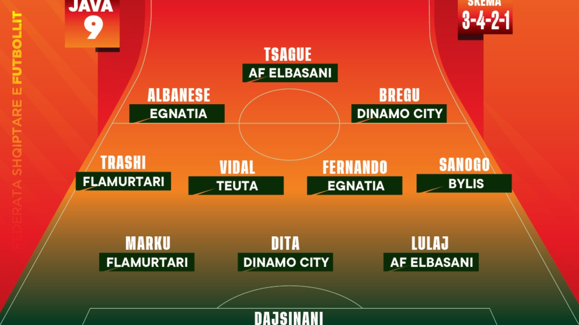 Për këtë raund, skema e preferuar është 3-4-3-2-1, me Mario Dajsinani të Egnatias në portë. Mbrojtësit e formacionit më të mirë janë Herald Marku (Flamurtari), Bruno Dita (Dinamo City) dhe Bruno Lulaj (AF Elbasani). Në mesfushë, janë përzgjedhur Lorenc Trashi (Flamurtari), Higor Vidal (Teuta), Fernando Medeiros (Egnatia) dhe Mohamed Sanogo (Bylis).