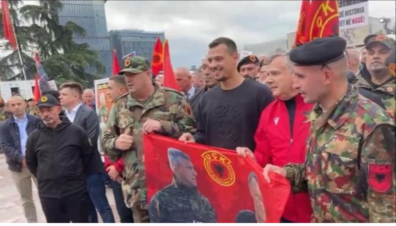 “LIRIA KA EMËR”/ Me flamurin e UÇK-s në duar, djali i Hashim Thaçit mbërrinë në sheshin Skënderbej
