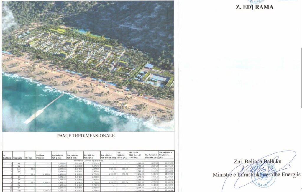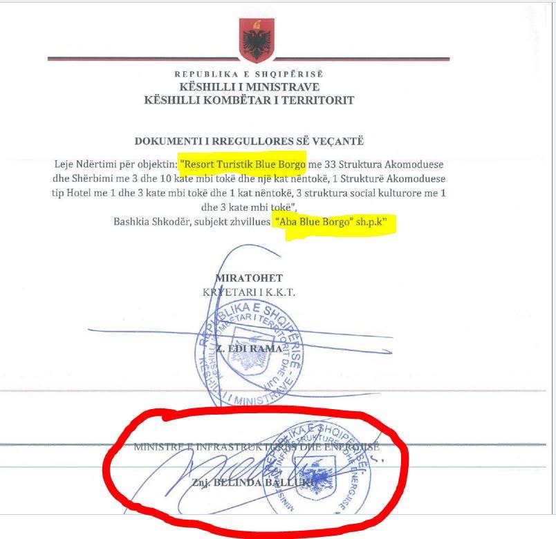 Ndërkohë, në kulmin e procedurave ligjire në Kuvend dhe në Gjykatën Kushtetuese për imunitetin, ministrja e Infrastrukturës dhe Energjisë ka firmosur pas një kalvari 13 mujor lejen e ndërtimit të resortit turistik “Blue Borgo”, i ndodhur në fshatin Baks Rrjoll, në Bashkinë Shkodër.