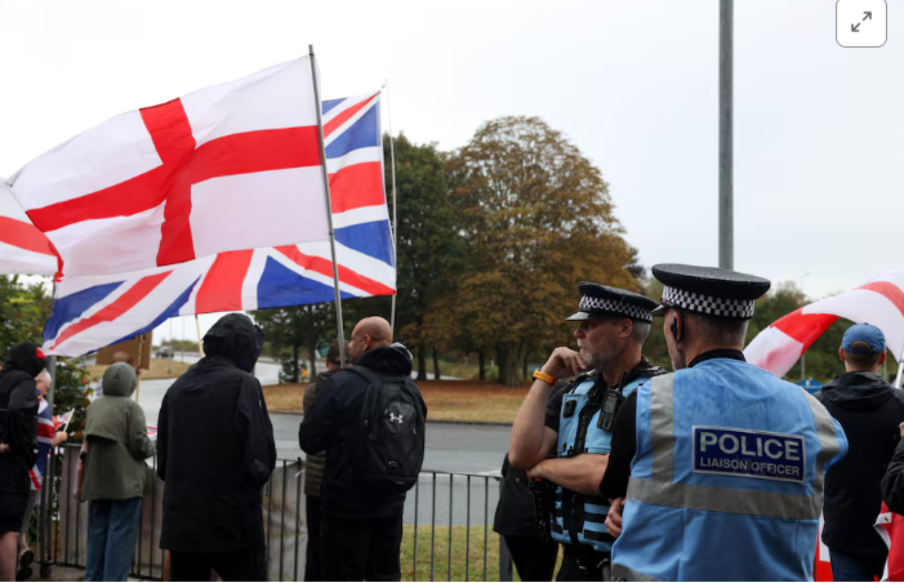 Dy grupe protestuesish kundër azilkërkuesve marshuan drejt Hotel Crowne Plaza afër Aeroportit Heathrow, para se disa demonstrues të përpiqeshin të thyenin hyrjen, njoftoi Policia Metropolitane e Londrës. Dy oficerë policie pësuan lëndime të lehta, thuhet në njoftim.