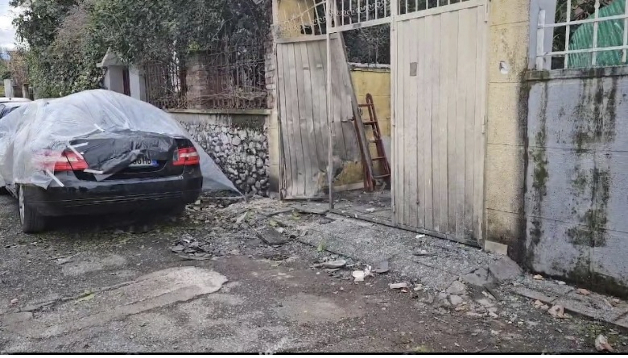 Pamjet nga vendngjarja tregojnë dëmet në portë dhe në makinën e parkuar aty pranë.