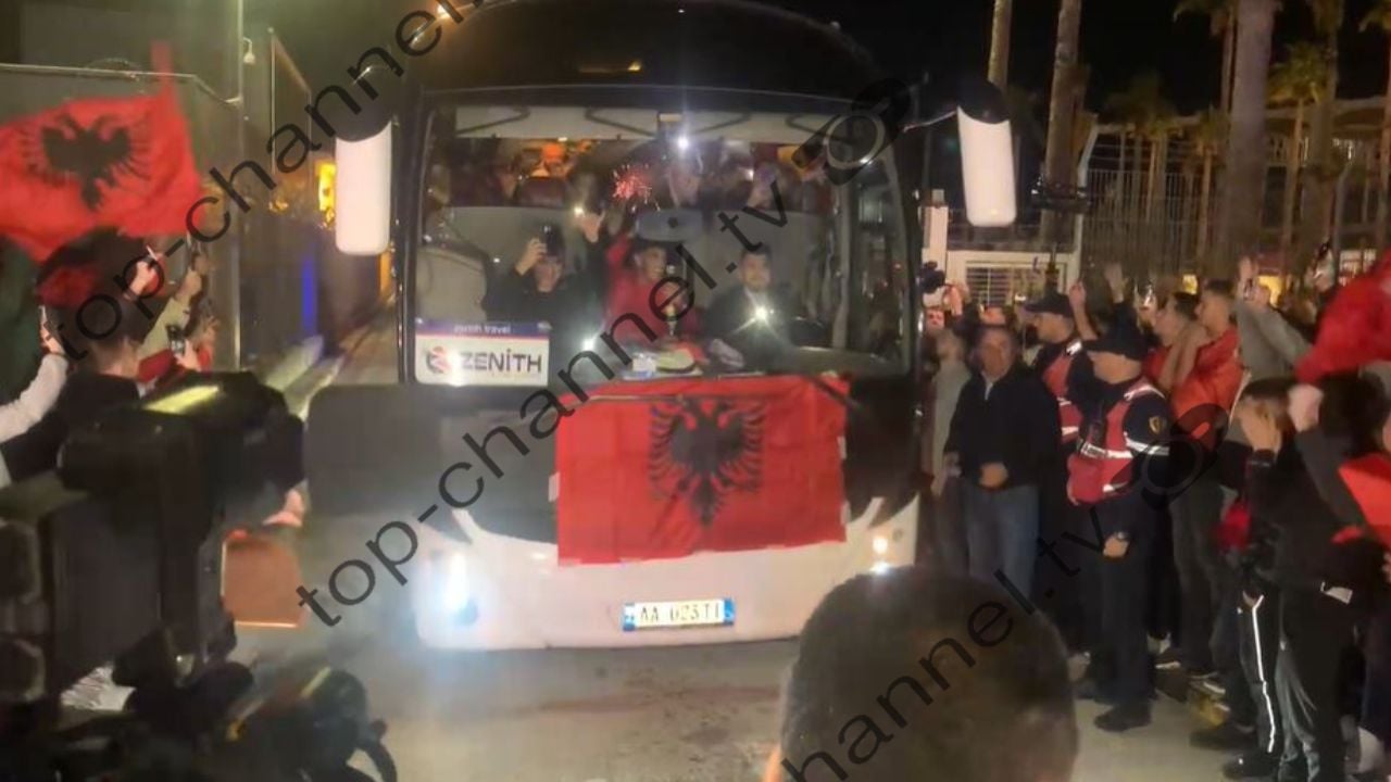 Pas mbërritjes, autobusi i Kombëtares u prit me entuziazëm nga qindra tifozë, të cilët kishin dalë për t’i bërë një pritje të ngrohtë. Flamujt kuq e zi dhe fishekzjarrët ishin pjesë e festimeve që kishin shpërthyer anës rrugës, duke treguar mbështetje të fuqishme për ekipin. Pamjet e këtij eventi emocionues janë siguruar nga Top Channel, që ilustrojnë atmosferën e gëzimit dhe krenarisë për arritjen e lojtarëve.