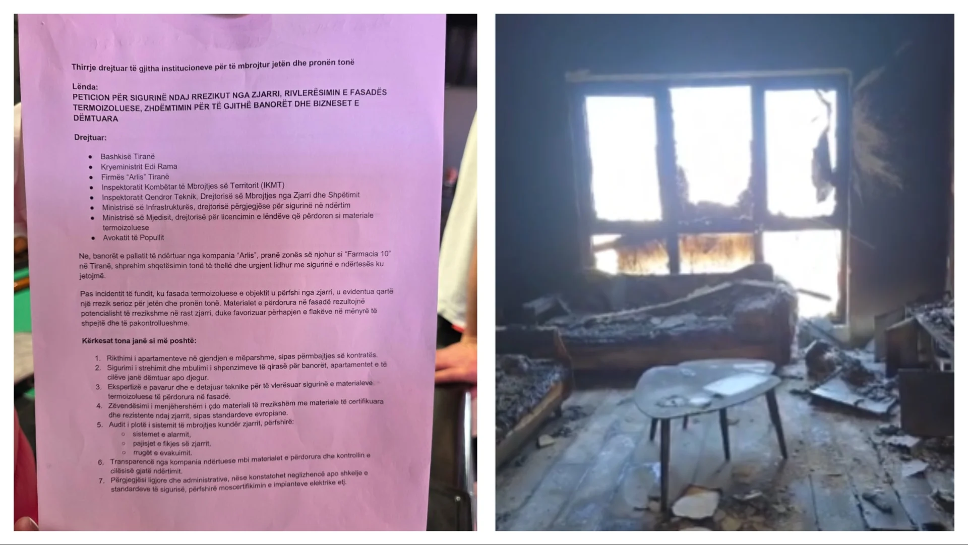 Banorët e kompleksit “Arlis” në zonën e Farmacisë 10, të prekur nga zjarri, nënshkruan një peticion ku parashtrojnë kërkesa konkrete lidhur me dëmet, sigurinë dhe përgjegjësitë. Ata kërkojnë dëmshpërblim për qiranë deri në rindërtimin e apartamenteve dhe formalizimin e çdo detaji të këtij procesi, si dhe vëmendje të veçantë për certifikimin dhe kolaudimin e sistemeve të sigurisë elektrike dhe të mbrojtjes kundër zjarrit apo fatkeqësive të tjera natyrore.